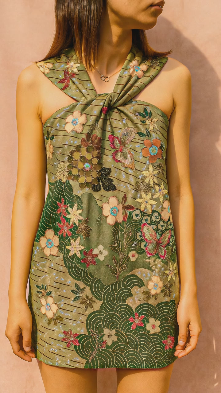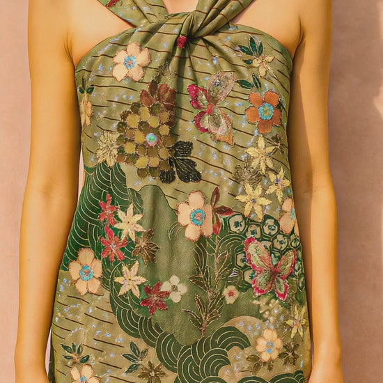 This is a halter neck dress is perfect for a breezy, natural look. The standout feature is its unique twisted knot detail at the neckline, where wide straps elegantly loop and gather at the center, creating soft draping across the bust.