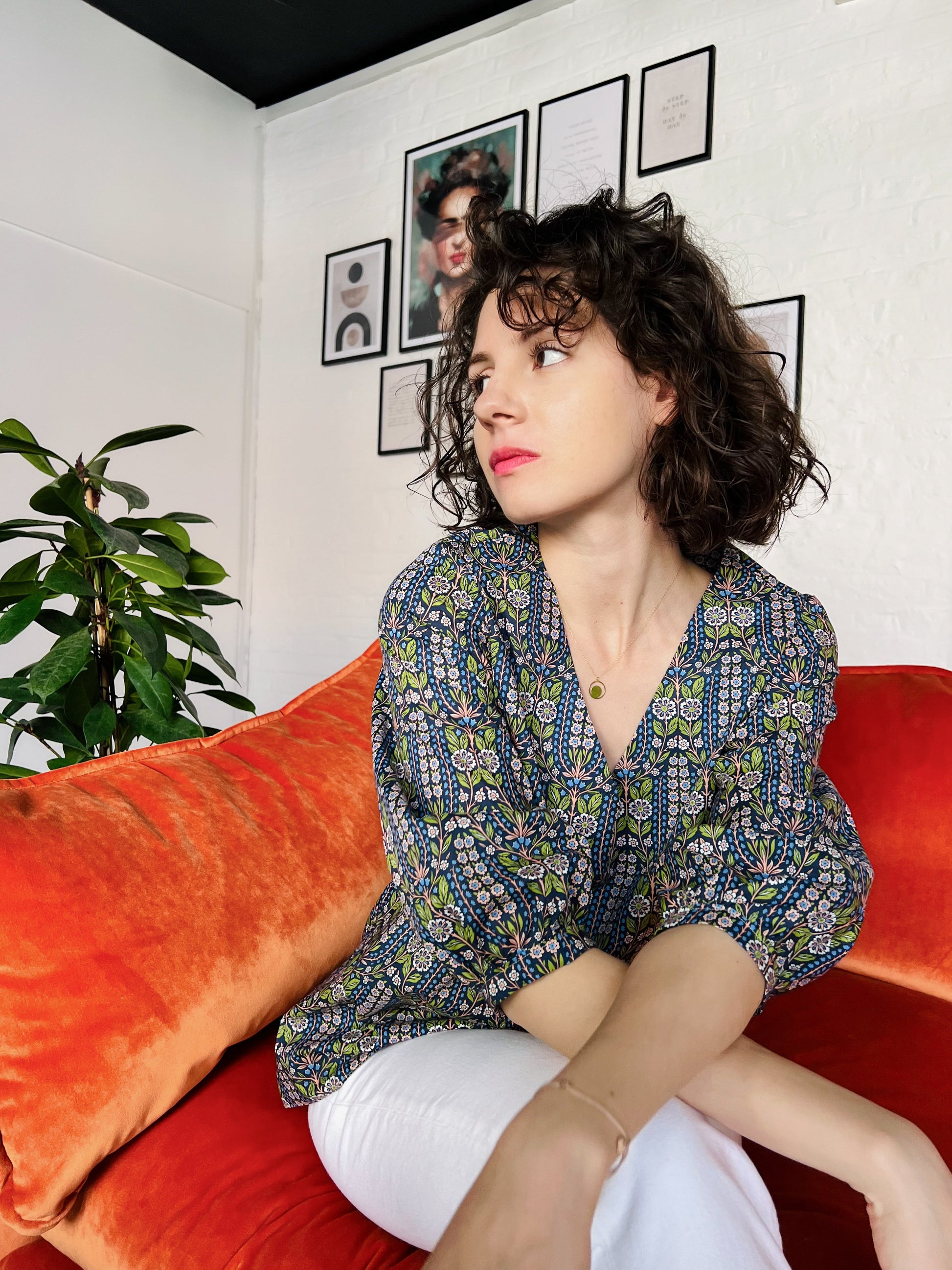 This Liberty print blouse is loose fitting with a V neck and bust dart. The voluminous, three quarter sleeves which are gathered at the hem, gives this blouse an elegant look.