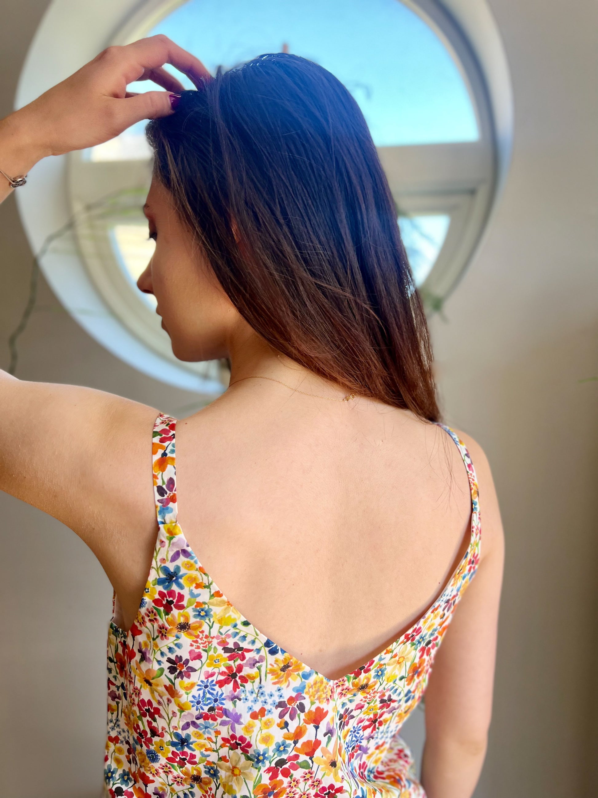 We`ve kept the silhouette simple with a V-neck and skinny straps.